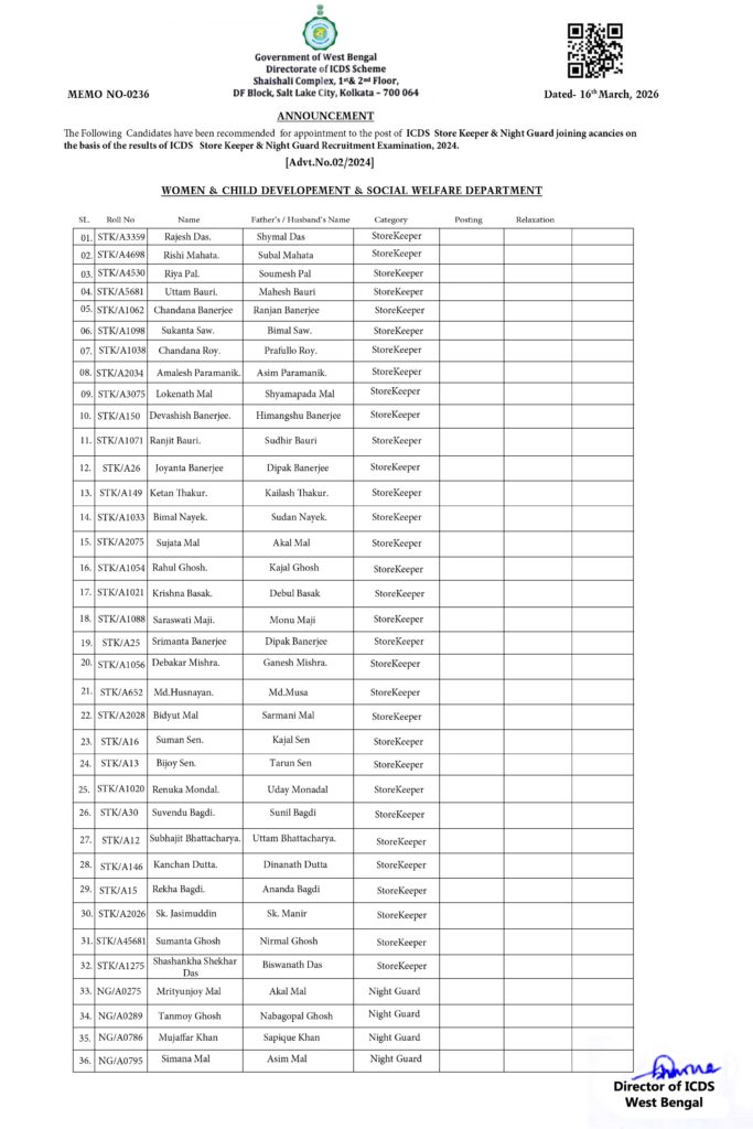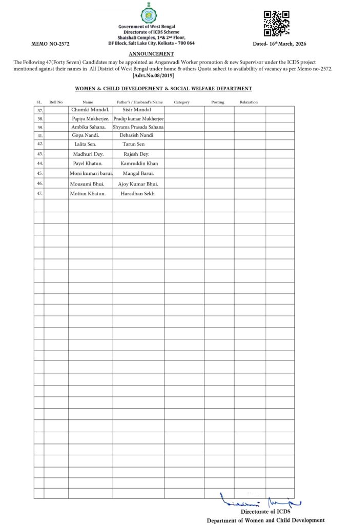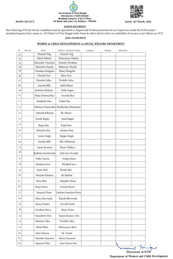 REVISED LIST OF RECOMMENDED CANDIDATES IN CANCELLATION OF THE LIST IN THE PREVIOUS ANNOUNCEMENT BEARING NO. A-118 P.S.C.(A) DATED 18.12.2025 FOR APPOINTMENT TO THE POSTS OF ICDS SUPERVISOR (FEMALE ONLY) AGAINST NON-JOINING VACANCIES ON THE BASIS OF THE REVISED RESULTS OF ICDS SUPERVISOR (FEMALE ONLY) RECRUITMENT EXAMINATION, 2019 [ADVT. NO. 08/2019]